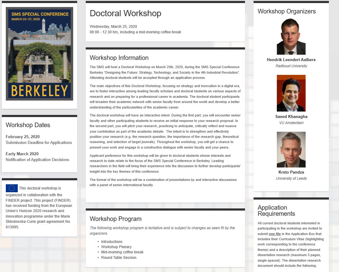 As you may recall, as part of the SMS Special Conference Berkeley “Designing the Future: Strategy, Technology, and Society in the 4th Industrial Revolution”, the Strategic Management Society was to host a Doctoral Workshop on March 25th, 2020. This event was an initiative of the FINDER program and would be hosted by Rick Aalbers (Radboud), Saeed Khanagha (VU) and Krsto Pandza (Univ Leeds). The main objectives of this Doctoral Workshop, focusing on strategy and innovation in a digital era, would be to foster interaction among leading faculty scholars and doctoral students on various aspects of research and on preparing for a professional career in academia. The doctoral student participants will broaden their academic network with senior faculty from around the world and develop a better understanding of the particularities of the academic career.