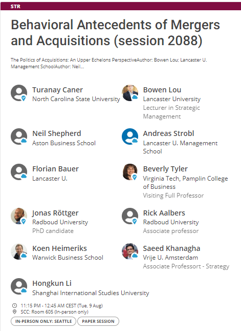 This time, I had the opportunity to present the paper we are developing on sequential strategies to conduct acquisitions and divestitures. The project has been quite exploratory due to two key novelties for me. First, while the sequence analysis approach has already been established by prior work, we advanced it by shifting to an evolving rather than static perspective. Second, the large volume of data required to model and assess these strategies presented a rewarding coding and computational challenge.