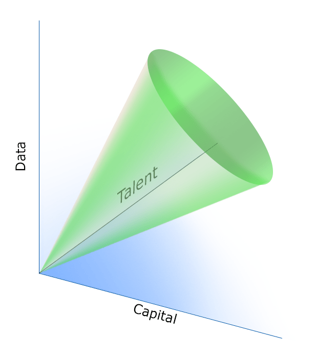 Similar to hallmark resource-based approaches, this viewpoint asserts that access to key resources is the key to finding a dominant position in ecosystems. However and somewhat particular to data-driven ecosystems, these key resources are interrelated proportionately. That is, a company must achieve an interlinked balance of capital, talent, and data in order to most effectively advance its position in its ecosystem. This viewpoint further posits that an overage of any of these resources without a correlated gain in the other two will result in an inefficient operating position, which could slow the company down enough to jeopardize its dominant advantage.