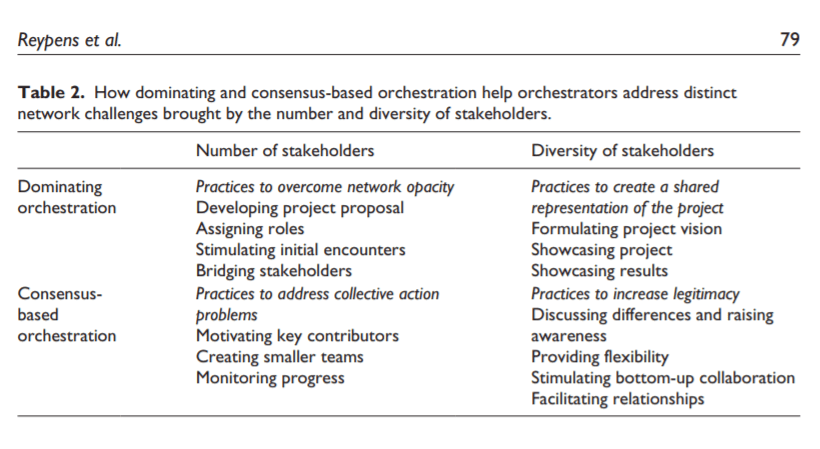 This section briefly extracts a few points that are practically relevant for managers finding themselves at the beginning of or in the midst of populated projects. The authors also included a chart in their work for this, which I’ve included below, that discusses specific orchestration practices that address the plurality as well as the diversity of stakeholders – again, the paper is worth a look for a more comprehensive explanation.